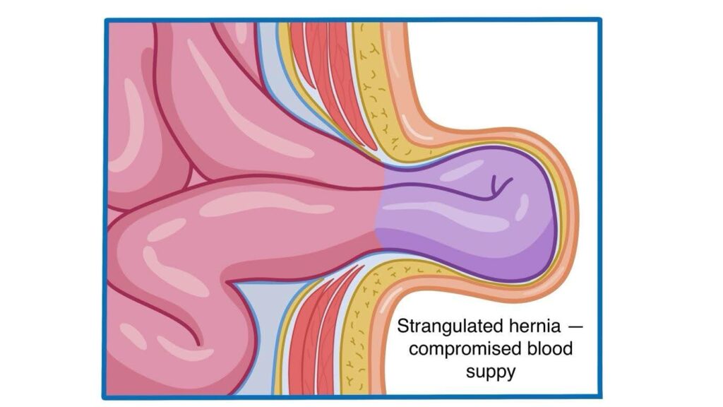 Strangulation – Blood supply to the herniated tissue is compromised, requiring urgent surgery